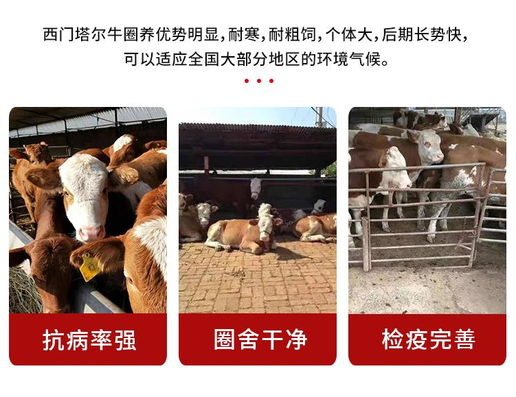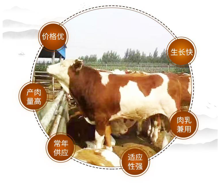 體格大(dà)、生(shēng)長快、肌肉多、脂肪少:西門塔爾牛公牛體高可達150-160厘(lí)米,母牛可達135-142厘米。腿部肌肉發達,體驅呈圓筒狀(zhuàng)、脂肪少。早期生長速(sù)度快,並以產肉性能高,胴體瘦肉多而出(chū)名(míng)。在雜交利用或改良地方品種時的優秀父本。具有典(diǎn)型的肉用性能:不同品種(zhǒng)的牛,在(zài)體格、體型(xíng)方麵是不同的,這使牛的生長率、產肉量和胴體組成方麵表現出較大差異。肉的營養價值高:肉牛蛋白質含(hán)量高達8%-9.5%,而且人食用後的消(xiāo)化率高達90%以上。牛肉脂肪能提供大量的熱(rè)能。牛肉的礦物質含量是豬肉的2倍以上。所以牛肉長期以來倍受(shòu)消費者的青睞。肉品等級高:西門塔爾牛的牛肉(ròu)等級明顯高於(yú)普通牛肉。肉色鮮紅、紋理細(xì)致、富有彈性、大理石花紋適中、脂肪色澤(zé)為白色或帶淡黃色、脂肪質地有(yǒu)較高的硬度、胴體體表脂肪覆蓋率100%。普通的牛肉很難達到這個標準。